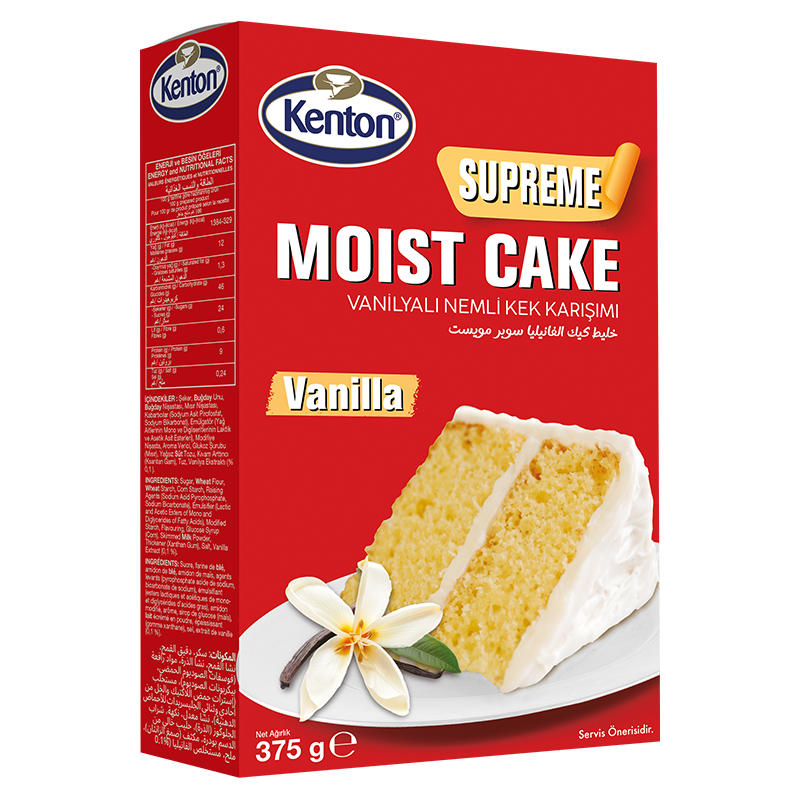 İÇİNDEKİLER: Şeker, Buğday Unu, Buğday Nişastası, Mısır Nişastası, Kabartıcılar (Sodyum Asit Pirofosfat, Sodyum Bikarbonat), Emülgatör (Yağ Aitlerinin Mono ve Digliseritlerinin Laktik ve Asetik Asit Esterleri), Modifiye Nişasta, Aroma Verici, Glukoz Şurubu (Mısır), Yağsız Süt Tozu, Kıvam Arttırıcı (Ksantan Gam), Tuz, Vanilya Ekstraktı (% 0,1 ).