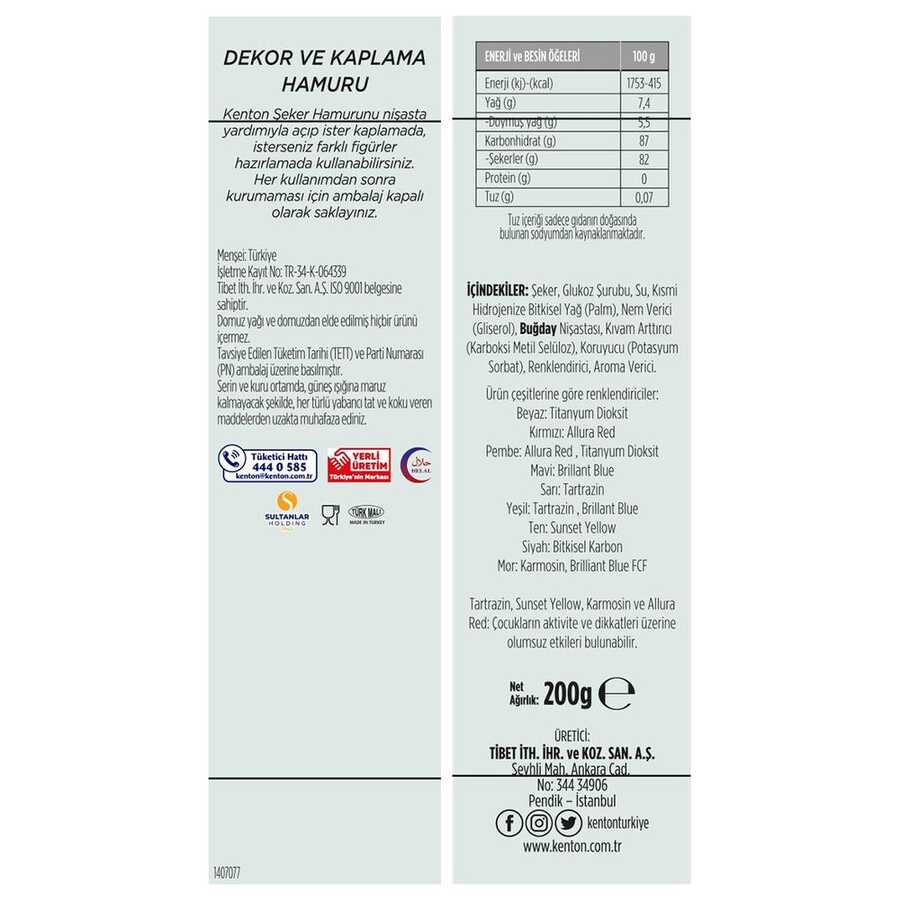 Hazırlanışı; Kenton Şeker Hamurunu nişasta yardımıyla açıp ister kaplamada, isterseniz farklı figürler hazırlamada kullanabilirsiniz. Her kullanımdan sonra kurumaması için ambalaj kapalı olarak saklayınız.